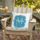 Un élégant coussin d'extérieur présentant un monogramme de famille gras avec initiale surdimensionnée, nom de famille écrit en script, et année d'établissement à l'intérieur d'un cadre décoratif sarcelle sur fond blanc. Tout le texte est entièrement personnalisable pour correspondre à vos détails de famille. Se coordonne magnifiquement avec des coussins d'extérieur rayés colorés pour une configuration de patio cohérente. Un cadeau personnalisé classique pour les inaugurations ou les étapes importantes de la famille.