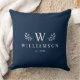 Monogramme rustique moderne nom personnalisé nouveau marié jetez oreiller avec votre nom de famille et initial ainsi que nous année établi entouré d'illustrations de branches fantaisie. Minimaliste, simple et élégant, ce riche coussin de famille bleu marine foncé est un cadeau mariage parfait et confortable!