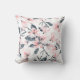 Un coussin avec un élégant motif fait avec une aquarelle illustration de fleurs roses avec feuilles et tiges bleu-gris.
