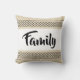 Une famille amusante jette un oreiller. Arrière - plan beige avec motif noir amusant en haut et en bas. White est au centre avec le mot Famille dans une jolie typographie amusante. Amusant et élégant !