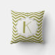 Coussin décoratif vert olive, blanc chevron zigzag motif lancer/lancer accent avec monogramme dans un cadre gris.