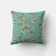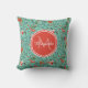 Un carré de couleur aquamarine lance l'oreiller avec un joli rouge orangé et une floraison de pêche avec des feuilles navals et verts. Personnalisez en ajoutant votre nom et votre monogramme à l'insigne d'octogone rouge tomate cerise. Cela fait partie de la collection Aquamarine Floral Cherry Tomato Red Monogram.