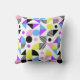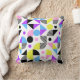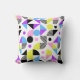 Ce coussin moderne présente un motif géométrique transparent et coloré avec des lignes et des formes en jaune, bleu, rose, violet et noir sur arrière - plan blanc.