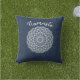 Ce mandala bleu marine moderne, coussin extérieur avec le dicton Namaste, est parfait comme décor de porche pour les amateurs de yoga, de méditations et d'art design. L'imprimé arrière - plan imite le lin lorsque le mandala ressemble à de la dentelle.