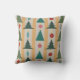 Cet oreiller de lancer a un design moderne du milieu du siècle des arbres de Noël et des ornements enfilés sur une guirlande avec un arrière - plan or et argent.