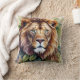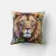 Une aquarelle coussin présente un lion, roi de la jungle, dans un cadre botanique avec des feuilles verts. Le portrait farouche de félins met en évidence la puissance et la beauté de la nature. Idéal pour les amateurs de gros chats et de zodiac Leos !