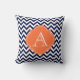 Coussin orange de monogramme de Chevron de bleu marine et de blanc.