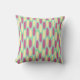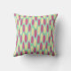 Cet oreiller de lancer a une conception géométrique de fait d'un arrière - plan de rectangles vert mer et bleu clair avec des ovales jaunes et roses sur le dessus.
