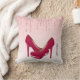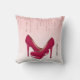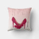 Un design moderne et tendance sur une coussin. L'arrière - plan a une image brillante, rose, goutte à goutte, (fausse) parties scintillant le long du sommet. Le reste de l'arrière - plan est un délicat dégradé de couleur rose pastel. Également illustré avec une paire de stilettos roses à talon élevé.