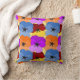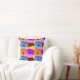 Cet oreiller de lancer a une conception ressort de violet, bleu, orange et rouge avec des panneaux jaunes disposés l'un sur l'autre sur un champ de jaune.