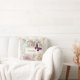 Coussin personnalisée avec un élégant papillon magenta rose aux accents violets. Un cadre blanc avec une bordure dorée est superposé sur un collage vintage abîmé aux roses roses et autres éléments décoratifs. Une ambiance chic et désuète.