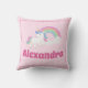Ce coussin personnalisé mignon et magique est doté d'un arrière - plan rose doux encadré d'une bordure rose-pensée. Un arc-en-ciel en faux parties scintillant de couleur pastel apparaît au centre avec une licorne correspondante placée devant lui. Un exemple de nom est imprimé ci-dessous dans une police rose lunatique que vous pouvez personnaliser pour inclure le nom de votre enfant.