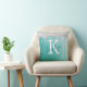 Turquoise coussin turquoise à lancer aqua avec arrière - plan métallique brossé et bordure en parties scintillant argentée personnalisée avec un monogramme blanc nom initial et écriture manuscrite en turquoise. Un cadeau idéal pour celui qui aime un peu scintiller ou décorer une chambre dans un style cool tendance. Contactez le concepteur via Zazzle Conversation ou makeitaboutyoustore@gmail.com si vous souhaitez modifier ce design sur un autre produit ou si vous souhaitez coordonner des éléments.