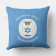 Coussin de vacances en plein air et décor Hanoukka avec un ange habillé du drapeau bleu et blanc d'Israël. Conçu pour les familles de religions multiples. L'ange-drapeau israélien d'Hanoukka vole à l'intérieur d'un cercle blanc de carrés grossiers, entouré d'un arrière - plan de carrés bleus. Ajoutez un nom à personnaliser. Customisez avec l'année. Ou, ajoutez votre propre texte.