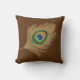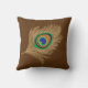 Dessin vectoriel d'une plume de paon, rehaussée et rendue dans un effet d'écrémage de côte doux - beige doré doux et plumes tan, avec rouille, bleu cobalt et vert émeraude oeil, sur un arrière - plan chocolat lancer oreiller