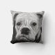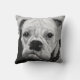 Ce coussin design noir et blanc unique montre la tête d'un taureau blanc. L'image de ce coussin est basée sur une peinture intitulée "Boo the Bulldog".