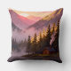 Add a warm and peaceful touch to your home with this stunning throw pillow featuring a pixel art sunset mountain landscape. The design showcases a cozy wooden cabin by the lake, surrounded by pine trees and misty mountains under a glowing sunset sky.