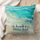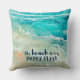 Ajoutez une ambiance de plage à votre maison avec ce confortable oreiller côtier en coton avec aquarelle tropicale turquoise et mousse de mer vagues de l'océan, l'étoile de corail et "la plage est mon endroit heureux" typographie dans un bleu marine nautique. Art par KL Stock
