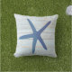 Plage oreiller décoratif extérieur jetez pour votre patio, véranda ou espace piscine dans un arrière - plan en bois rustique avec un design d'étoile bleu aquarelle.