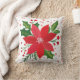 Un oreiller à jetons carré présente un design festif. La coussin est composée d'un arrière - plan blanc avec un motif de petits points éparpillés dans différentes tonalités de rouge et de rose. Centrée sur la coussin est une grande fleur de poinsettia rouge stylisée avec des pétales pointus. Le centre de la fleur est orné d'un amas de petits points blancs, ressemblant aux étamines de la fleur. Autour des poinsettia se trouvent des sprigs de feuilles verts saints avec des bords déchiquetés et des grappes de petites baies rouges. L'ensemble est simple et graphique, avec des couleurs plates et des lignes épurées, ce qui lui donne un aspect moderne et gai.