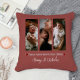 Personnalisez une tenue unique pour une nouvelle maman qui célèbre sa première fête des mères avec cet oreiller en terre cuite trois photo collage jetez. Le design coussin comprend trois placements photo en panneau avec typographie moderne et écriture élégante et deux coeurs rouges. Un souvenir photo parfait pour que maman fête sa première fête des mères.