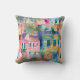 Ce magnifique oreiller en coton jeté dispose d'une aquarelle préppie motif des maisons Charleston classiques dans les tons rose, bleu, jaune et vert.