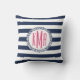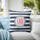 Habillez votre maison de plage, chambre, canapé ou dortoir avec cet oreiller à jetons de monogramme très chic. Le design comprend de larges bandes bleu marine et blanc et votre monogramme initial en rose magenta chaud à l'intérieur d'un badge de corde circulaire.