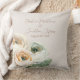Cet oreiller romantique à jetons floral présente un élégant arrière - plan couleur ivoire avec des fleurs de ranunculus aquarelle. Un délicat bouquet de pêche et de ranunculus blanc est représenté sur le fond. Les noms d'un échantillon de couple marié et la date du mariage sont imprimés ci-dessus. Vous pouvez personnaliser le coussin pour inclure vos propres noms ou texte personnalisés.