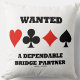 Montrez votre côté pont wry / dupliqueur avec cet oreiller de lancer avec les quatre costumes de carte avec le dicton "Recherché A Dependable Bridge Partner".