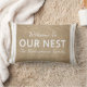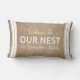 Ce petit coussin mignon éclairera n'importe quel espace avec son message d'agrément. Il comporte une conception brune rustique d'arrière - plan d'impression d'armure avec les mots "accueil à NOTRE NID", à frontière blanche de rayures, aussi bien qu'à votre nom de famille personnalisé dessous dans le blanc.