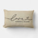 Moderne et élégant design lombaire sur mesure avec oreiller conception simple et minimaliste de la typographie "Amour" en noir qui comprend des détails florissants et de coeur. Personnalisez le texte majuscule ci-dessous avec un monogramme pour un couple ou une famille, un devis ou un autre texte préféré. Un arrière - plan de lin rustique ajoute un charme vintage qui complète le décor de maison de ferme.