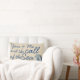 Joli et élégant coussin lombaire de plage avec la phrase "You & Me and the call of the sea" en bleu foncé accentué avec un design détaillé de coquillages bleus. Le dos du coussin a la lettre initiale de votre famille et le nom complet en écriture.