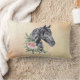 Coussin avec une belle illustration d'une tête de cheval noire avec un embellissement floral fantaisie par son cou. Peinture animale élégante et classe. L'arrière - plan a un design abstrait soigné dans une couleur jaune clair avec des faux éclats d'or.