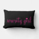 Perfectionnez pour une chambre à coucher ou la pièce de dortoir, ce coussin lumineux et gai comporte la fille de sororité de mots sur un arrière - plan noir solide et un motif noir et blanc de chevron sur le dos.
