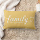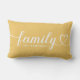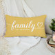 Un oreiller lombaire jaune doré personnalisé avec le mot Famille en écriture cursive cœur blanc avec un monogramme de nom de famille personnalisable. Le design blanc sur jaune doré apporte une touche chaleureuse et joyeuse aux salons, chambres ou entrées. Tout le texte est entièrement modifiable pour personnaliser avec le nom de famille. Un cadeau significatif pour une pendaison de crémaillère ou une réunion de famille.
