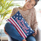 Coussin patriotique avec le drapeau des Etats-Unis avec ses étoiles et rayures en rouge, bleu et blanc, avec la légende Fier Américain dans une police rouge moderne avec une bordure blanche.