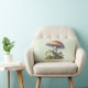 Oreiller avec une illustration cool. Avec une grenouille verte assise sur un monticule d'herbe. Un gros champignon rouge le protège des intempéries. Quelques petits champignons à proximité.