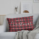 Coussin lombaire décorative sur mesure avec design de typographie moderne "Joyeux Noël" avec votre nom de famille sur motif de chèque en buffle rouge festif.