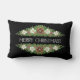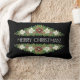 Un Coussin chic de Noël Lumbar ou Cushion, avec des Roses de Noël, Holly et Ivy sur un arrière - plan noir, avec Joyeux Noël en lettres modernes et élégantes, en blanc. D'un dessin peint à la main par Judy Adamson.