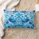 Coussin Lumbar dans un William Morris, motif de tapisserie Art Nouveau intitulé "The Strawberry Thief", d'oiseaux stylisés, de fleurs, de fraises et de feuilles, numériquement rehaussés et colorés dans les tons d'indigo turquoise et bleu cobalt, sur un arrière - plan blanc