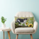 Un mignon chat, tuxedo motif bicolore noir et blanc, European Shorthair, marchant sur une branche d'arbre dans un jardin avec des tournesols fleuris. Les chats ont un sens de l'équilibre exceptionnel et ils parviennent à un équilibre gracieux. Photo prise par Katho Menden. Ce coussin est une idée cadeau pour les amoureux de les chats.