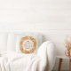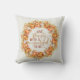 Coussin qui dit, "Donnez Merci avec un coeur gracieux" dans une police manuscrite, entourée d'une couronne de citrouille et de feuilles. L'Arrière - plan a un look subtil en relief.