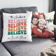 Créez des souvenirs durables en ajoutant l'une de vos photos de famille préférées à ce coussin festif de couleurs rétro "We Believe in Santa Claus".