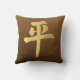 Le front coussin a le symbole asiatique pour la richesse, la prospérité et la chance avec l'apparence de l'or incarné en cuir daim brun. Le dos a la calligraphie pour la paix dans le même look gaufré or.