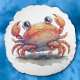 Un coussin rond avec une aquarelle illustrant un crabe très mignon.