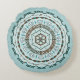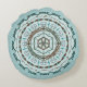 Ce modèle de mandala présente des couches de motifs blancs, turquoise et marron inspirés des tissages celtes et des médailles indiennes, comme des vignes, des rubans et des fleurs de lotus.