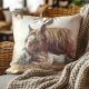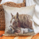 Le décorateur lance l'oreiller avec une peinture rustique d'une ferme de campagne représentant un cheval et un enfant dormant paisiblement dans un lit de foin.
