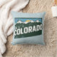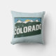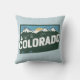 L'oreiller élégant est doté d'une silhouette pittoresque rétro de l'état du Colorado, avec les Rockies et le texte en gras sur l'arrière - plan bleu clair.
