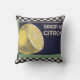 Un oreiller à jetons vintage est muni d'une annonce de sirop de citron français / étiquette "Sirop de citron" avec bordure en damier ajoutée.
