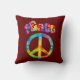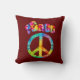 oreiller rétro à jetons 70's dispose d'une cravate super colle signe de paix avec texte courbé sur un arrière - plan rouge foncé